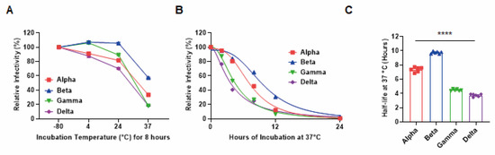 Different thermal stability of four SARS-CoV-2 variants. (A) The relative infectivity of each variant after incubation at 4, 24, or 37 °C for 8 h as evaluated via the focus-forming assay. (B) Nonlinear regression of the relative infectivity of each variant following prolonged incubation (2, 4, 8, 12, and 24 h) at physiological temperatures (37 °C). (C) Average half-life values for each variant at 37 °C. All error bars indicate the standard errors of the mean. Mean values for the half-life were compared using one-way ANOVA in GraphPad Prism 8.0 software. Statistical significance was set at p < 0.05 (****, p < 0.0001).