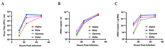 Viral replication rate of four SARS-CoV-2 variants. (A) The infectivity of the progeny viruses was evaluated via plaque forming assay completed at 12, 24, and 48 h post infection. (B) Extracellular and (C) intracellular viral RNA were assessed by qRT-PCR with SARS-CoV-2 NP probes. All error bars indicate the standard errors of the mean.