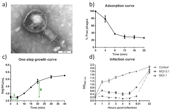 When the lytic bacteriophage vB_KpnM-VAC66 (representing a virus of Bacteria, infecting K. pneumoniae, with myovirus morphology, named vB_KpnM-VAC66 [18]) was characterized, it was observed that it produced clear plaques of 1 mm of diameter in plates of TA supplemented with 1 mM CaCl2. The virion morphology was observed by TEM, which revealed the typical structure of a tailed bacteriophage belonging to the Myoviridae family, with an icosahedral capsid of approximatively 100 nm in length and 77 nm in width, and a rigid and contractile tail of around 107 nm long and 26 nm wide (Figure 1a).
