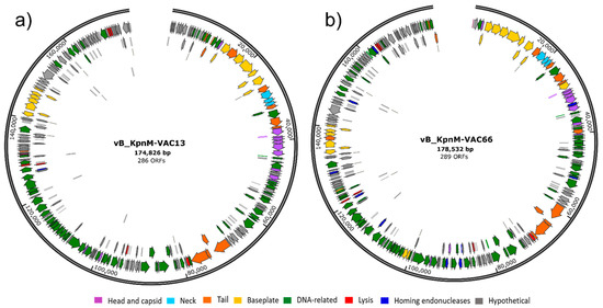 Circular representations of vB_KpnM-VAC13 (a) and vB_KpnM-VAC66 (b) genomes, created with SnapGene® 5.3.2.