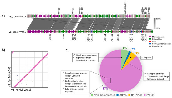 (a) Comparison between genomes of phages vB_KpnM-VAC13 and vB_KpnM-VAC66, plotted with EasyFig_2.2.5. (b) Dot plot comparison between both genomes, vB_KpnM-VAC13 (X axis) and vB_KpnM-VAC66 (Y axis) using the ViPTree online tool. (c) Percentage identity between all the nucleotidic sequences in both genomes, assessed using the blastn tool (https://blast.ncbi.nlm.nih.gov/Blast.cgi?PAGE_TYPE=BlastSearch, accessed on 18 September 2021).