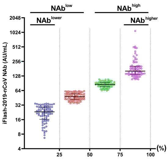 The level of SARS-CoV-2 NAb in 306 individuals 6 months after recovering from COVID-19. Patients were divided into NAbhigh (median (IQR): 108.8 (85.0, 161.8) AU/mL) and NAblow groups (34.9 (23.1, 48.1) AU/mL), based on the median NAb levels. In addition, 50% of individuals in the upper NAbhigh and lower NAblow, were further classified into NAbhigher (155.3 (116.6, 200.7) AU/mL) and NAblower groups (23.2 (16.2, 30.1) AU/mL). NAb, neutralizing antibody.