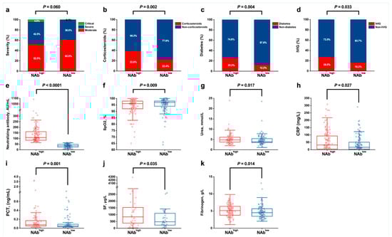Various patient factors and clinical indicators between the NAbhigh group and the NAblow group at admission. (a), severity; (b), corticosteroids; (c), diabetes; (d), IVIG; (e), neutralizing antibody; (f), SpO2; (g), urea; (h), CRP; (i), PCT; (j), SF; (k), fibrinogen. NAb, neutralizing antibody; IVIG, intravenous immunoglobin; SpO2, pulse oxygen saturation; CRP, C-reactive protein; PCT, procalcitonin; and SF, serum ferritin.