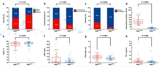 The difference in various indicators between the NAbhigher group and the NAblower group at admission. (a), severity; (b), corticosteroids; (c), diabetes; (d), neutralizing antibody; (e), SpO2; (f), CRP; (g), fibrinogen; (h), PCT. SpO2, pulse oxygen saturation; CRP, C-reactive protein; and PCT, procalcitonin.