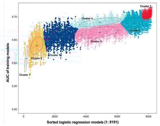 The logistic regression model correlated with the AUC scores, based on Gaussian mixture models for predicting the levels of NAb six months after recovery from COVID-19. There are 7 clusters of 8091 combinations; the optimal model has an average accuracy of 0.7117. Each color or shape represents a different cluster clustered by Gaussian clustering, and the horizontal coordinates represents the number of combinatorial models generated. The asterisks represent the core positions in the clusters, and the covariance matrices of the clusters bind together to form circular class clusters. The shape of the n-dimensional Gaussian distribution is determined by the covariance of each class cluster.