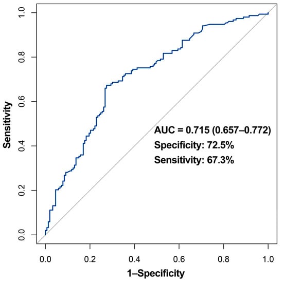 Overall, the developed predictive model consisted of 9 clinical indicators, including age; gender; disease severity; corticosteroids therapy; IVIG; and diabetes comorbidity, as well as the SpO2, urea, and CRP level, which were found to influence the NAb levels six months after recovery from COVID-19. The model displayed an average accuracy of 0.7117 for the GMM classifier (Figure 4). To validate the predictive effect of the combination indicators, the ROC analysis was conducted. The predictive model had an AUC value of 0.715 (0.657–0.772), whereas its specificity and sensitivity were 72.5% and 67.3%, respectively (Figure 5).