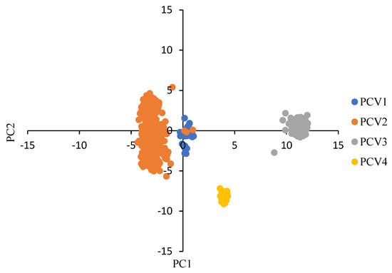 As shown in Figure 1, the results of PCA indicated that the first and the second principal components (PC1 and PC2) accounted for 57.55% and 12.47% of total variation. All points were clearly distributed into four clusters, representing the four PCV species, although there was a certain overlap between PCV-1 and PCV-2.