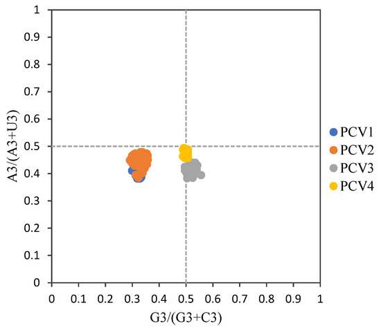For overall PCVs, the ENC values ranged from 52.42 to 57.46 (54.71 ± 0.87) and all values were higher than fifty, which implies a weak usage bias among all these four PCV species. Furthermore, the mean ENC values for PCV-1, PCV-2, PCV-3 and PCV-4 were 56.53 ± 0.87, 54.42 ± 0.75, 55.57 ± 0.39 and 54.48 ± 0.37, respectively. The ENC-plot (Figure 2) showed that all points were below the expected curve based on GC3 composition and formed four clusters based on PCV species. Furthermore, in the PR plot (Figure 3), all points for PCVs were located at the bottom of the plot, indicating an imbalance usage was found between A3, U3 and G3, C3, which further confirmed that the codon usage bias of PCVs is influenced by both natural selection and mutation pressure. The only partial exception is represented by PCV-4 since the points were located just below the plot center.