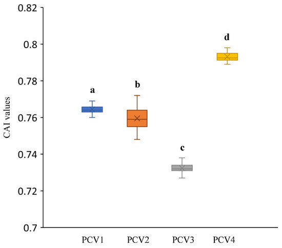 CAI values for each PCVs species. Different low-case letters represented statistically significant differences among different PCVs genotypes.