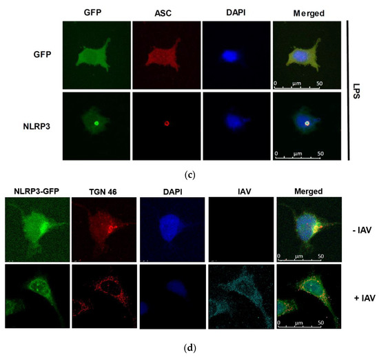 To test whether IAV infection would induce dTGN formation, NLRP3-GFP-expressing cells were infected with Sk02 for a period of 80 min and were observed under the confocal microscope (Figure 1d). In mock-infected cells, NLRP3-GFP shows small blobs of intact TGN near the cell nucleus, whereas the infected cells show dTGN formation described as puncta structures drifting away from the nucleus.