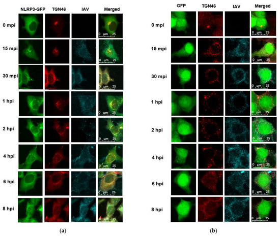 To understand the kinetics of dTGN formation, NLRP3 recruitment, and ASC speck formation after IAV infection, we conducted viral infection and fluorescent microscopy. As seen in Figure 2a, at 0 min p.i., NLRP3-GFP was observed throughout the cell with the majority being in the cytoplasm in a diffused pattern—it started aggregating at 15 min p.i. and progressed until 6 h.p.i. Over these time periods, NLRP3-GFP formed puncta and were co-localized with dTGN. By 8 h.p.i., the puncta disappeared and NLRP3-GFP resumed diffusion throughout the cell. In contrast, in GFP-expressing cells, IAV infection caused TGN dispersion, however, GFP was diffused across the cell throughout the infection (Figure 2b). These data reconfirmed that IAV infection-induced TGN dispersion and suggested NLRP3 is recruited into the dTGN.