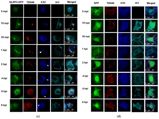 To investigate at what point the ASC is recruited to NLRP3, we transfected NLRP3-GFP cells with a plasmid expressing ASC followed by IAV infection. ASC seems to co-localize to the dTGN-NLRP3 puncta from 1 h.p.i. and continue to 8 h.p.i. (Figure 2c). In the absence of NLRP3, ASC itself was diffused across the cell and did not form any specks after IAV infection (Figure 2d). These results suggest that ASC is recruited to the site of dTGN-NLRP3.
