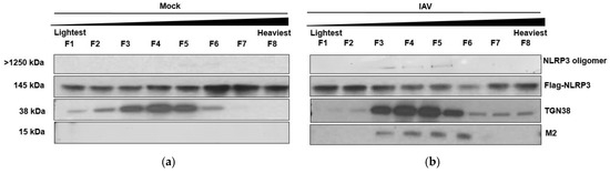 Three plates (10 cm in diameter) of HEK293T cells were transfected with 1 µg pCMV-3×Flag–NLRP3 for 36 h and were then infected with Hf09 WT at an MOI of 5 for 4 h. The cells were then homogenized using a Dounce homogenizer in isotonic buffer [0.25 M sucrose, 10 mM Tris-HCl (pH 7.5), 10 mM KCl, 1.5 mM MgCl2, and protease inhibitor cocktail and centrifuged at 1000× g for 5 min to remove the nucleus pellet (P1)]. The supernatant (S1) was further centrifuged at 5000× g for 10 min to obtain a heavy membrane fraction (pellet, P5), while this supernatant (S5) was centrifuged at 100,000× g for 20 min to separate the light membrane fraction (pellet, P100) from the cytosol fraction (supernatant, S100). P5 and P100 were washed with isotonic buffer once and resuspended in the same buffer. The P5 fraction was then used for sucrose gradient ultracentrifugation separately [12].
