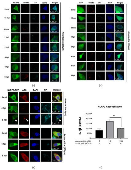 The M2 protein is an integrated viral membrane protein that functions as an ion channel and is responsible for acidification of the endosome upon endocytosis [21,22]. The M2 protein becomes active while moving along the exocytic pathway and equilibrates the pH between the lumen of TGN and the cytoplasm [23]. We hypothesized that the M2 protein is involved in the induction of TGN dispersion, leading to the NLRP3 recruitment and inflammasome activation. We first examined whether IAV infection would induce NLRP3 oligomerization in the TGN and whether they are associated with M2 protein. Here, Flag-NLRP3-expressing cells were infected by wild-type Hf09 for 4 h. The cells were harvested and fractionated to separate light membrane fractions containing TGN organelles by ultra-centrifugation. We observed that TGN is most abundantly detected in fractions 1–6 in mock-infected cells (Figure 3a) and fractions 3–8 in infected cells, fraction 1 being the lightest and fraction 8 being the heaviest. In concomitant, M2 and NLRP3 oligomers were co-migrated with the TGN in infected cells (Figure 3b). In contrast, NLRP3 oligomers were not observed in mock-infected cells. Next, we assessed if blocking the M2 ion channel function had any effect on the formation of dTGN. For this, we used Amantadine, which is a known inhibitor of the M2 ion channel protein. Amantadine binds to the transmembrane domain of M2, the domain, and prevents the activation of M2 [24]. According to our previous study, the NS1 protein of Hf09 is known to suppress the activation of the NLRP3 inflammasome through inhibiting ASC ubiquitination, whereas the Sk02 strain does not have such an effect [16]. Therefore, we used the Sk02 virus for this part of the experiment; GFP or NLRP3-GFP-expressing cells were infected with Sk02 WT virus at an MOI of 10 in the presence of amantadine, a known M2 ion channel inhibitor [25]. Dispersion of the TGN was not observed in cells expressing either NLRP3-GFP (Figure 3c) or GFP (Figure 3d) throughout the infection. We further tested the effect of amantadine on ASC speck formation, which is an indicator of the NLRP3 inflammasome activation. After viral infection, ASC specks were observed in untreated cells, however, were not seen in cells treated with amantadine (Figure 3e). We also quantified the level of NLRP3 activation by performing an IL-1β ELISA. Upon blocking M2 function by amantadine, there was a drastic decrease in IL-1β level in IAV-infected cells in comparison to that in the absence of amantadine (Figure 3f). All the data indicate that M2 is important for the formation of dTGN and the activation of NLRP3.