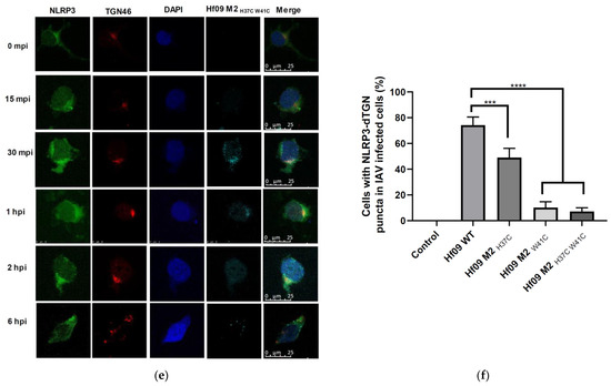 To further investigate the role of M2 in TGN dispersion and NLRP3 inflammasome activation, we generated three mutant influenza viruses with functionally inactive M2 protein [11,26]. These mutations are present in the transmembrane domain of the M2 protein yet do not change the amino acids sequence of the M1 protein (Figure 4a). The transmembrane domain of the M2 protein forms a channel pore, and His37 and Trp41 are located inside the pore. While His37 is a sensor for ion selectivity, Trp41 is the gate [25,27]. The mutant viruses, namely Hf09 M2H37C, Hf09 M2W41C, and Hf09 M2H37C-W41C bear a single mutation at residue His37, Trp41, or double mutations at His37 and Trp41 on the M2 protein, respectively. The viruses were first characterized for their ability to replicate in an MDCK-M2 cell line. All the mutant viruses replicated to similar titers and exhibited similar growth kinetics as did the WT virus. Consistently, the viral early (NP) and late protein (NS1) were synthesized to similar levels between the mutant viruses and the WT virus in MDCK-M2 cells (Figure 4b). These data demonstrate that the mutant viruses did not have any unwanted mutations that impaired viral replication other than the desired ones.