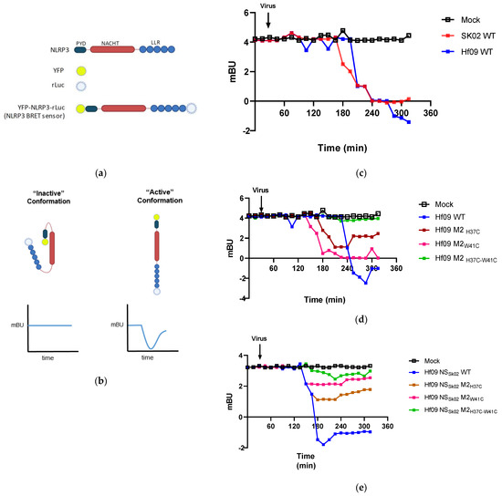 Using these viruses, we conducted a bioluminescence resonance energy transfer (BRET) assay to analyze how the M2 mutations would affect the NLRP3 conformational change. It is known that upon sensing the presence of DAMP or PAMP signals, NLRP3 changes its confirmation from the closed inactive state to the open active state [28]. For the BRET assay, HEK293T cells were transfected with a plasmid encoding NLRP3 BRET sensor (Figure 6a). In the closed or inactive conformation, the distance between luciferase and the YFP is less than 10 nm, this allows the donor (luciferase) to transfer non-radiative energy to the acceptor (YFP) resulting in fluorescence emission at a characteristic wavelength of 530 nm. The energy emitted by the acceptor relative to that emitted by the donor is termed the BRET signal which is expressed as milli-BRET Unit (mBU) [29]. A decrease in the BRET signal indicates a change in the conformation of the NLRP3 leading to the open or active conformation (Figure 6b). We first examined the BRET signal in response to wild-type Sk02 and Hf09 infection (Figure 6c). We observed a 4 to 5 mBU dip over the period of infection, confirming IAV infection caused a conformational change in NLRP3. We further tested the degree of conformational change in NLRP3 in response to infection by IAV M2 mutants. We observed that Hf09 M2H37C, Hf09 M2W41C, and Hf09 M2H37C-W41C all caused a reduced degree of mBU dip as compared to the WT Hf09 virus infection, of which, Hf09 M2H37C-W41C led to a least mBU dip of 1 (Figure 6d). Similarly, analysis of the reassortant Hf09 viruses carrying the NS gene derived from Sk02 showed a similar pattern (Figure 6e), compared to the Hf09 NSSk02 WT whose infection led to a dip of over 4 mBU, mutations on M2 resulted in a reduced degree of mBU dips, indicating that loss of M2 ion channel activity impairs the activation of NLRP3.