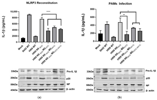 To test how the mutations on M2 would impact the ability of the virus to induce IL-1β because of NLRP3 activation, we conducted an NLRP3 reconstitution assay followed by infection (Figure 7a) as well as PAMs infection with the respective virus (Figure 7b) and measured the production of IL-1β. In agreement with our previous results, in both reconstitution and PAMs infection assays, Sk02 WT infection induced a significantly high level of IL-1β production, however, Hf09 WT infection produced only a similar level of IL-1β as in the mock-infected cells. As expected, replacing the Hf09 NS segment with that of Sk02 (Hf09 NSSk02) could restore the ability to induce IL-1β production. Mutations on the M2 protein, namely H37C, W41C, and H37C/W41C could significantly reduce IL-1β production. Western blotting results showed the reduction in mature IL-1β levels was not due to the decreased pro-IL-1β synthesis nor the insufficient viral replication. The level of p20, as a result of NLRP3 inflammasome activation and the cleavage of caspase-1, is consistent with the IL-1β level detected by ELISA, indicating that changes in IL-1β were attributable to NLRP3 inflammasome activity.