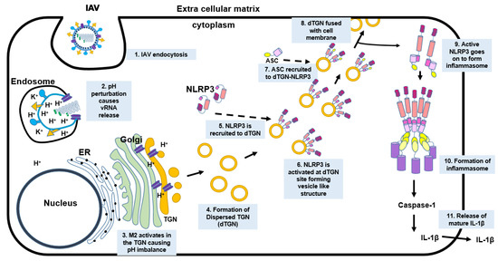 Schematic representation of the working model. Upon endocytosis of IAV, the pH of the endosome (pH 6) activates the IAV M2 ion channel protein leading to the release of vRNP into the cytoplasm. The vRNP then translocates into the nucleus to undergo transcription and translation. The newly translated M2 protein travels from the ER through the Golgi apparatus and reaches TGN. The pH of the TGN (pH 6) causes a pH disparity in the pH-sensitive organelle which leads to the dispersion of the TGN (dTGN). The NLRP3 molecules then travel to the newly formed dTGN where the NLRP3 undergoes conformational changes, oligomerization, and becomes active. The ASC molecule is then recruited to the site of dTGN-NLRP3, where the NLRP3 binds to ASC from its PYD domain. The NLRP3–ASC complex then leaves the dTGN and goes on to form the inflammasome, while the dTGN goes on to fuse with the cell membrane. The active NLRP3 inflammasome then leads to the production of active caspase-1 which then converts pro-IL-1β to mature IL-1β. The mature IL-1β is then released into the extracellular matrix, which then signals other immune cells to travel to the site of infection.