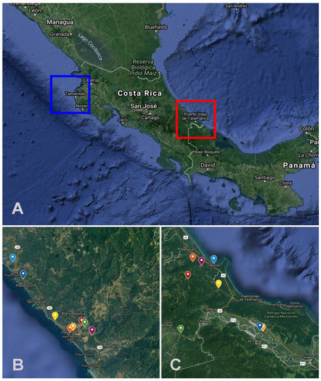 (A) Geographic locations of the sampling sites in Costa Rica, the squares indicate Santa Cruz (Northern Pacific) (10°16′00″ N, 85°39′00″ W) and Talamanca (Southern Caribbean) (09°44′28″ N, 82°50′46″ W). (B,C) Each sampling unit is highlighted in these two regions. Maps Source: Map data ©2021 Imagery ©2021 TerraMetrics and CNES/Airbus, Lansat/Copernicus, Maxar Technologies, US Geological Survey from GoogleMaps.