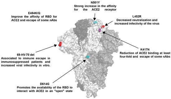 In addition to the D614G and N501Y mutation in RBD, variants B.1.351 and P.1 have acquired the E484K/T mutation in the RBD, respectively [41]. Variants with the K484 mutation have been reported to improve the affinity of RBD for ACE2 but only 1.4-fold [28]. They have also been related to the evasion of the immune response [42,43,44]. On the other hand, the K417N mutation is also present in variants B.1.351 and P.1, and this results in a reduction of ACE2 binding by at least four-fold [28]; however, it has been identified as a determinant for the evasion of the induced immune response in previously infected individuals [43,44,45]. The recent emergence of variant B.1.617.2 has shown that other S glycoprotein mutations should be monitored; this variant contains the mutation L452R, associated with an improvement in viral infectivity due to a higher affinity of RBD for ACE2 [46,47,48].