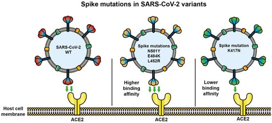 Mutations are classified as re-assortment, recombination, and antigenic drift. The high mutation rate of some RNA viruses, as occurs with the influenza virus, causes loss of effectiveness of the vaccines and can also generate interspecies jumping promoting zoonoses [65,66]. Antigenic drift and antigenic shift are commonly observed in influenza viruses, whereas with coronaviruses, recombination is often seen [67]. Besides, coronaviruses present a great diversity, and this is due to the low fidelity of RdRp, coupled with the fact that coronaviruses have a long genome that presents a high recombination rate [66]. SARS-CoV-1 and Middle East respiratory syndrome coronavirus (MERS-CoV) have emerged from animal’s coronaviruses, mutating through infection in animals to reach humans [68,69,70,71]. Particularly, in SARS-CoV-2, the variant B.1.1.7 (also known as VOC 202012/01) quickly became predominant due to its high transmission potential [41,72]. Another SARS-CoV-2 variant (from South Africa, variant 501Y.V2) contains the mutations K417N, E484K, and N501Y in the S glycoprotein. This variant probably was originated in an immunocompromised individual with prolonged infection [41,73].
