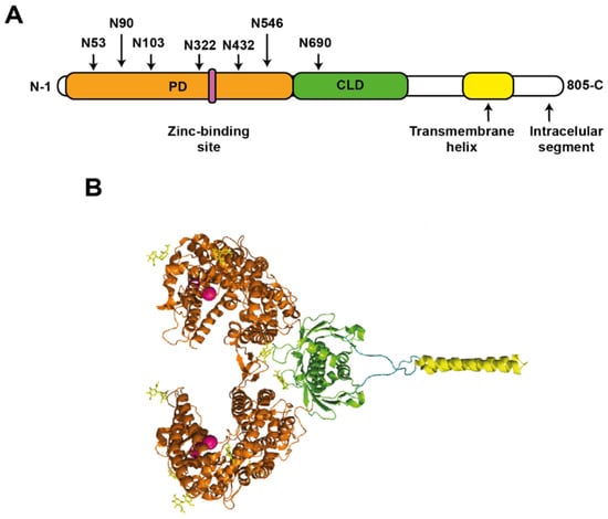 Angiotensin-converting enzyme 2 (ACE2) structure. (A) Schematic representation of the ACE2 protein. Peptidase domain (PD) and collectrin-like domain (CLD) are also shown. The N-glycosylation sites are shown as arrows for each amino acid residue, indicating their relative position in PD and CLD. (B) Structure of ACE2. According to panel A, the domains and motifs are shown, except the intracellular segment (PDB: 6M17).