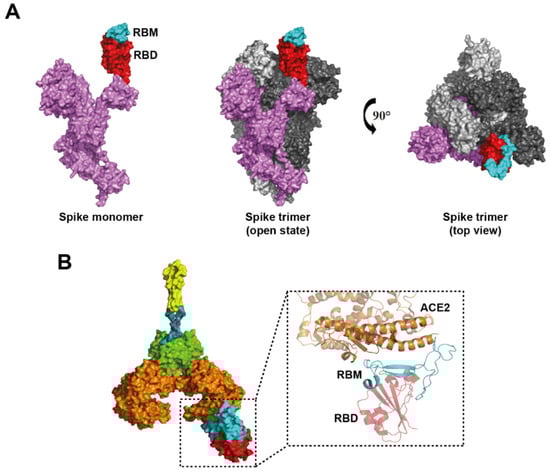The ACE2-S complex is formed through the interaction of subdomain I of PD in ACE2 (primarily by residues of the N-terminal α-helix) and residues of the RBM present in RBD. It has been determined that 19 residues in ACE2 interact with 20 amino acids of RBD [138,139] (Figure 5B).