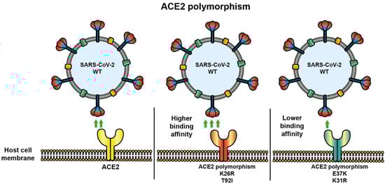 In one prediction and structure study, ACE2 variants were analyzed according to the possibility of interaction with SARS-CoV-2 glycoprotein S. Variants with an increased susceptibility prediction were E23K, H378R, I21V, K26R, N64K, Q102P, S19P, T27A, and T92I, whereas variants with a possible protective effect against SARS-CoV-2 infection were D355N, D38V, D509Y E35K, E37K, F72V, G326E, G352V, H34R, K31R, K68E, M62V, N33I, N51S, Q388L, Y50F, and Y83H, showing decreased binding to SARS-CoV-2 glycoprotein S based on structural analysis. In addition, it was confirmed that K31R and E37K ACE2 polymorphisms had decreased affinity, whereas K26R and T92I ACE2 polymorphisms had increased affinity to S glycoprotein [132,142] (Figure 6).