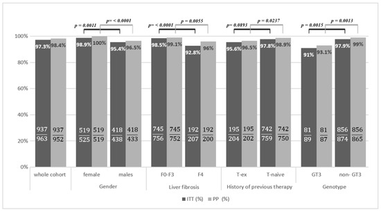 Patients with liver cirrhosis responded in a significantly lower percentage as compared to those with fibrosis F0–F3, both in ITT (92.8% vs. 98.5%, p < 0.0001) and PP analysis (96% vs. 99.1%, p = 0.0055). A worse response to the therapy was also obtained in treatment-experienced patients compared to treatment-naïve individuals, 95.6 vs. 97.8%, p = 0.0893, in the ITT and 96.5% vs. 98.9%, p = 0.0237, in PP analysis, respectively. The efficacy comparison carried out, taking into account the HCV genotype, revealed that patients infected with GT3 achieved a lower SVR than those infected with other genotypes, 91% vs. 97.9%, p = 0.0015, in the ITT and 93.1% vs. 99%, p = 0.0013, in PP analysis (Figure 1).
