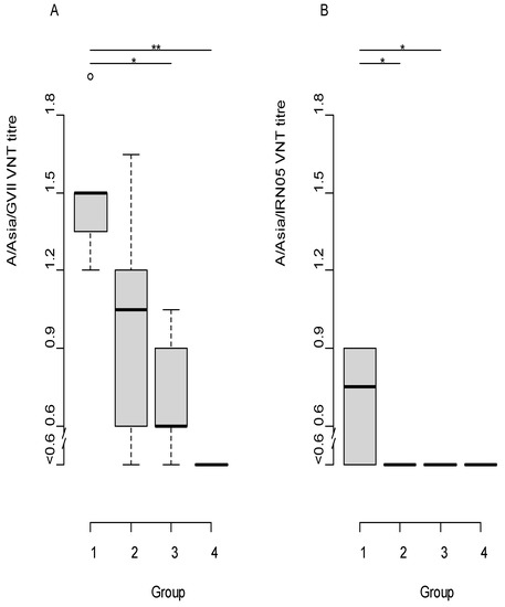 Box plot of VNT titres of cattle vaccinated with A/G-VII on the day of challenge (21 dpv). The horizontal line represents the median titre for each group. In panel (A) the VNT titres against A/IRN/22/2015 are shown (representative A/G-VII field isolate); in panel (B) the VNT titres against A/IRN/10/2018 are shown. Group 1 = Full dose, 2 = 1/4 dose, 3 = 1/16 dose, 4 = Unvaccinated Control); * = p < 0.05 and ** = p < 0.01. The boxplots show the interquartile range (median represented as the thick horizontal line within the box, and the first and third quartile of the data) and the minimum and maximum values for each group connected to the boxes with the vertical line.