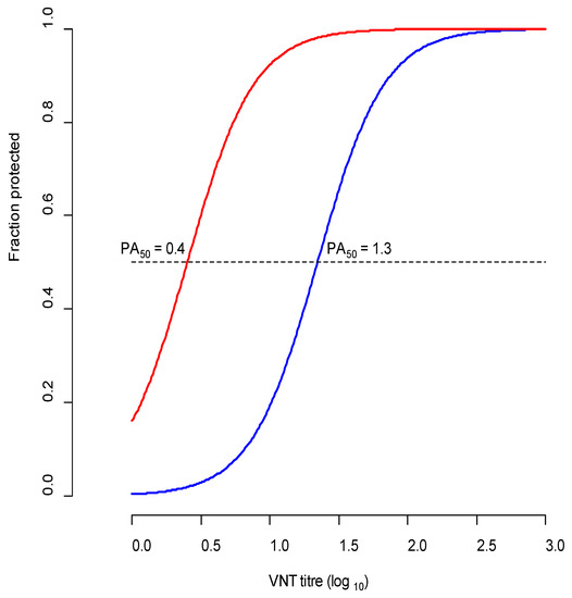 Logistic regression plot showing the relationship between VNT titres against A/IRN/22/2015 (representative A/G-VII field isolate) of cattle vaccinated with A/G-VII vaccine on the day of challenge (21 days post vaccination) and protection. The red line indicates protection after challenge with A/IRN/22/2015, and the blue line indicates protection after challenge with A/IRN/10/2018. Horizontal dotted line for 50 percent protection intersects the regression lines at the PA50 values for A/G-VII and A/IRN/05 protection.