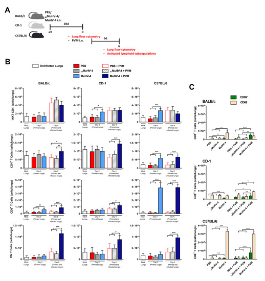 - Lymphoid lineage; the recruitment pattern of lymphoid subpopulations in mock-primed mice was similar in all three strains, with an increase in the numbers of iNKT CD4−, iNKT CD4+, and NK cells (more marked in BALB/c and CD-1 than in C57BL/6) while the numbers of B cells, CD4+, CD8+, γδT, and DN T cells remained stable (Figure 2B and Figure S8). Qualitatively speaking, the PVM caused an increase in the proportion and absolute number of CD69+, thus activating lymphoid cells. However, past infection with MuHV-4 further modified the leukocyte response to PVM infection. Compared to mock-primed mice, an expansion of the pool of CD4+, CD8+, and DN T cells was observed in all three strains (Figure 2B), along with an exacerbation of the expansion of the iNKT CD4+ cell subpopulation in C57BL/6 and strain-specific expansions of specific subpopulations already measured on day 0 following MuHV-4-priming: B cells in C57BL/6 and γδT cells in BALB/c mice (Figure S8). Qualitatively speaking, the general rule that emerged following MuHV-4 priming was an increase in the absolute number of activated CD8+ T cells 6 days post PVM inoculation (Figure 2C);