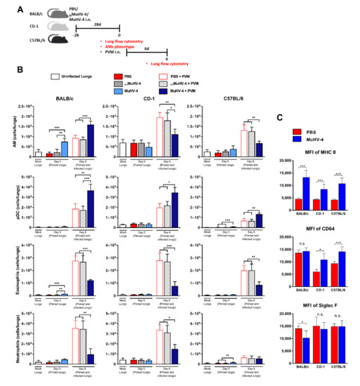 3.2. MuHV-4 Priming Affects the Leukocyte Subpopulations Recruitment in Lungs Prior and After PVM Inoculation in a Murine Strain-Dependent Manner