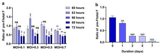Production of high-pre-F RSV virus stocks and thermal stability assay results. (a) Vero cells were infected with RSV A2 at the indicated MOI, and the virus was harvested at the indicated time points. The ratio of the results of sandwich ELISA using AM22, a pre-F-specific antibody, to the results of sandwich ELISA using motavizumab, a total F antibody, is shown. (b) The thermal stability of pre-F was tested by incubation with virus at 4 °C, and the ratio of pre-F to total F was calculated by sandwich ELISA at the indicated time points. All bars represent the mean ± SD from three experimental replicates combined and (a) the data were analyzed by two-way ANOVA followed by Dunn’s multiple comparisons post hoc test to compare the ratio of 60 h post infection with the ratio of each other time of infection (b) the data were analyzed by one-way ANOVA followed by Dunn’s multiple comparisons post hoc test to compare the ratio on day 0 with the ratio on each other day. The p values are shown by asterisks (ns, not significant; ** ; *** ; **** ).
