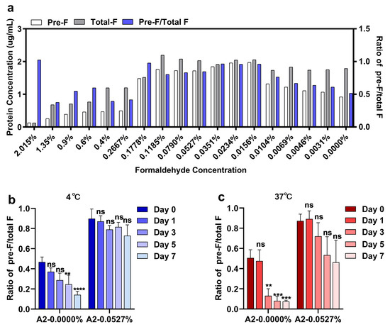It has been reported that pre-F is absent from the surface of FI-RSV, which subsequently induced high titers of binding antibody with weak neutralizing and fusion-inhibitory activity. These antibodies in the context of large antigen load led to immune complex deposition and complement activation in airways upon subsequent RSV infection and thus induced ERD [18]. We therefore evaluated whether an optimized formaldehyde concentration can preserve pre-F on virions as it does on cell surfaces [24]. Freshly produced virus stocks were treated with different concentrations of formaldehyde, and the original virus stocks were treated in the same manner except that no formaldehyde was added. As previously reported [18], we found that the relative binding of pre-F decreased rapidly under treatment with lower concentrations of formaldehyde (0.0000–0.0104%) (Figure 2a), while both the pre-F binding and the total F binding were nearly lost under treatment with higher concentrations (0.2667–2.015%) (Figure 2a). Surprisingly, within specific concentrations (0.0156–0.1778%) (Figure 2a), we found that both the pre-F and the total F were preserved and that the pre-F level was significantly higher than that of untreated virus stocks. To explore whether formaldehyde fixation improved the stability of pre-F on virions, thermostability was later evaluated, and 0.0527% was selected as the preferred concentration for subsequent experiments. We found that RSV A2 virions treated with the optimized formaldehyde concentration were more thermostable than untreated RSV virions when preserved at 4 °C or 37 °C with a prolonged incubation duration (Figure 2b,c). These data demonstrate that an optimized formaldehyde concentration can not only preserve the pre-F on virions but also improve thermostability.