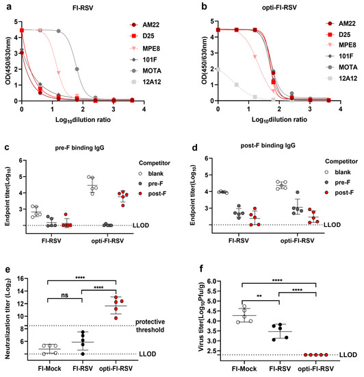 Opti-FI-RSV is immunogenic and protective without causing ERD in cotton rats. Female cotton rats (n = 5 per group) were injected intramuscularly with FI-Mock, FI-RSV or opti-FI-RSV in a prime-boost regimen at week 0 and week 3. Animals were challenged with the RSV A2 strain intranasally at a titer of PFU on day 49. (a,b) Serial dilutions of the vaccine were incubated with biotinylated pre-F specific antibodies (AM22, D25, AM14) and total F target mAbs (MPE8, 101F, MOTA) or a post-F-specific mAb (12A12), and a secondary mAb conjugated with streptavidin was used to test the binding of the vaccine and the mAb. (c,d) Pre-F- and post-F-specific antibody levels were determined using a competitive ELISA. (e) Serum neutralizing antibody titers were measured using RSV A2 as described in the Materials and Methods. (f) RSV virus titers were determined in the right lung homogenate of cotton rats at day 5 after challenge as determined by PFU. The symbols indicate individual rats, the bars/lines indicate the geometric mean ± geometric SD, and the dotted lines indicate the lower limit of detection and the protective threshold. (e,f) The data were analyzed by one-way ANOVA followed by Tukey’s multiple comparisons post hoc test to analyze the differences between vaccination groups. The p values are shown by asterisks (ns = not significant; ** ; **** ).