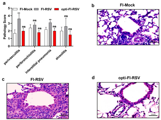 Histopathology following RSV challenge in cotton rats. To evaluate for vaccine attributable enhanced disease post challenge, groups of five cotton rats were inoculated intramuscularly with FI-Mock, FI-RSV, and opti-FI-RSV. All animals were challenged with A2 on day 49 p.i. Left lungs were harvested on day 5 after challenge, and histopathology scoring was performed. Pathology score was calculated as described in the method (a). Representative haematoxylin and eosin stains for (b) FI-Mock, (c) FI-RSV, (d) opti-FI-RSV vaccinated rats are shown. Scale bars represent 200 . The bars/lines indicate the mean ± SD. (a) The data were analyzed by Kruskal-Wallis test (nonparametric) to analyze the differences between vaccination groups. The p values are shown by asterisks (ns = not significant; ** ).