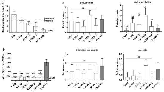 Immunization with low doses of recombinant RSV F protein in both the pre-F and post-F conformations induces ERD in cotton rats and BALB/c mice [36,37]. Since recombinant proteins and opti-FI-RSV are both non-replicating vaccines, we next evaluated whether ERD occurs upon immunization with suboptimal doses of opti-FI-RSV. Cotton rats were immunized with opti-FI-RSV at various doses (0.00016–1.6 , quantified by sandwich ELISA). After two doses of immunization, blood samples were collected to determine the neutralizing antibody levels prior to the challenge. Five days after the challenge, the lungs were harvested to determine the virus titers and histopathology scores. Neutralizing activity against RSV A2 was strongly induced at a dose equal to the FI-RSV immunization dose, as described above, and decreased along with a decrease in dose (Figure 5a).