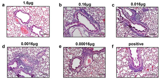 Representative haematoxylin and eosin stains for Alhydrogel-adjuvanted opti-FI-RSV at various doses are shown. (a) 1.6 , (b) 0.16 , (c) 0.016 , (d) 0.0016 , (e) 0.00016 , (f) positive.