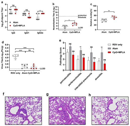CpG + MPLA adjuvanted opti-FI-RSV avoids the risk of ERD caused by suboptimal immunization. Female cotton rats (n = 5 per group) were injected intramuscularly with opti-FI-RSV combined with a Th2-biasing adjuvant (Alum) or a Th1-biasing adjuvant combination (CpG + MPLA) in a prime-boost regimen at week 0 and week 3. Animals were challenged with the RSV A2 strain intranasally at a titer of PFU on day 49. (a) Pre-F specific IgG, isotype IgG1 and IgG2a serum antibodies were determined at 2 weeks after boosting. (b) Serum neutralizing antibody titers were measured using RSV A2 as described in the Materials and Methods. (c) IgG avidity against pre-F after a 7 M urea wash was determined at 2 weeks after boosting. (d) RSV virus titers were determined in the right lung homogenate of cotton rats at day 5 after challenge as determined by PFU. (e) Left lungs were harvested at day 5 after challenge, and histopathology scoring was performed. (f–h) Representative H&E staining images are shown. (a,b,d) The symbols indicate individual rats, the bars/lines indicate the geometric mean ± geometric SD, and the dotted lines indicate the lower limit of detection and the protective threshold. (c) The symbols indicate individual rats, and the bars/lines indicate the mean ± SD. (e) The bars/lines indicate the mean ± SD. The data were analyzed by (a–c) t test and, (d) one-way ANOVA followed by Tukey’s multiple comparisons post hoc test and (e) Kruskal-Wallis test (nonparametric) to analyze the differences between vaccination groups. The adjusted p values are shown by asterisks (ns = not significant; * ; ** ; **** ).