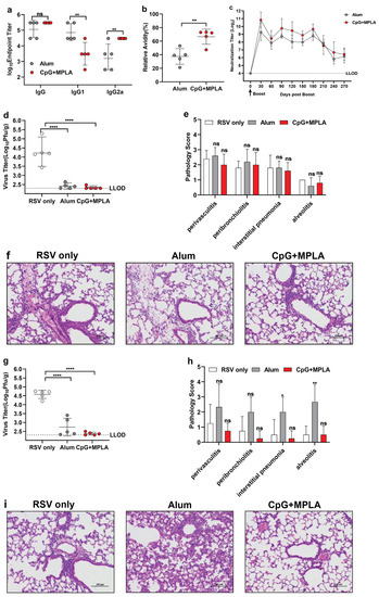 Opti-FI-RSV plus CpG + MPLA adjuvant protects mice from RSV challenge without inducing ERD when neutralizing antibody titers decrease. Female BALB/c mice (n = 5 per group) were injected intramuscularly with opti-FI-RSV combined with a Th2-biasing adjuvant (Alum) or a Th1-biasing adjuvant combination (CpG + MPLA) in a prime-boost regimen at week 0 and week 3. Animals were challenged with the RSV A2 strain intranasally at a titer of PFU on day 49 and day 273. (a,b) Pre-F-specific IgG, isotype IgG1 and IgG2a serum antibody titers were determined at 2 weeks after boosting, and IgG avidity against pre-F after 7 M urea wash was determined at the same time point. (c) Serum neutralizing antibody titers were measured using RSV A2 with the indicated schedule. (d,e) Lung virus titers and histopathology scores were evaluated at day 5 after the first challenge (d,e) and second challenge (g,h). Representative staining images are shown in (f,i). (a–d,g) The symbols indicate individual mice, the bars/lines indicate the geometric mean ± geometric SD, and the dotted lines indicate the lower limit of detection and the protective threshold. (g,h) The bars/lines indicate the mean ± SD. The data were analyzed by (a,b) t test, (d,g) one-way ANOVA followed by Tukey’s multiple comparisons post hoc test and (e,h) Kruskal-Wallis test (nonparametric) to analyze the differences between vaccination groups. The adjusted p values are shown by asterisks (ns = not significant; * ; ** ; **** ).