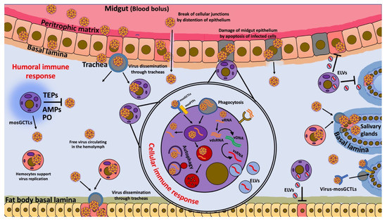 Hemocytes’ immune response during viral infections. Hypothetical model of possible functions of hemocytes during viral infection. Blood meal contains viruses that trigger the production of digestive enzymes and midgut distention, which disrupt cellular junctions and cause apoptosis in midgut epithelium cells (gray square cells). These effects facilitate virus dissemination, allowing infection of cells and trachea via gaps in the cellular junctions and via apoptosis of cells. Viruses released from the midgut epithelium can be freely transported in the hemolymph or by infected hemocytes (circular purple (uninfected) and pink cells (infected)) that are distributed in the flowing hemolymph to secondary tissues, such as fat bodies and salivary glands, which receive the virus through the tracheal system. Hemocytes can facilitate the entry of a virus into cells of various tissues through the production of mosquito galactose-specific C-type lectins (mosGCTLs) and protein tyrosine phosphatases (mosPTPs). However, hemocytes also produce phenoloxidase (PO), antimicrobial peptides (AMPs), and thioester-containing proteins (TEPs), which are involved in virus elimination. In addition, in the later stages of infection, hemocytes take up free viruses by endocytosis or phagocytosis of apoptotic cells, together with cellular debris containing virus and dsRNA; they then develop viral small interfering RNAs (vsRNAs) that are released by exosome-like vesicles (ELVs) to enter infected cells and confer virus resistance through the RNAi pathway. Finally, hemocytes can also eliminate viruses by autophagy.