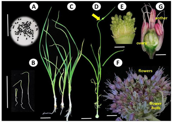 Representative samples of fertile garlic genotypes from true seed to flowering at different stages of development. Scale: A = 3 cm, B, D = 5 cm, C = 2 cm; E, F, G = 1 cm. (A) true garlic seeds. (B) five days old seedlings. (C) adult plants from cloves. (D) pre-anthesis garlic plant, with scape and spathe (arrow) visible. (E) flowers at early stages of development in the young inflorescence. (F) matured inflorescence, older flowers with anthers are visible at the umbel top, young flowers and flower buds are located in the lower part of the inflorescence. (G) cross-section of a post-anthesis flower. Anthers and an ovary are visible.