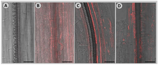 Calibration of FISH protocol for garlic leaf tissues. Scale = 80 µm. (A) Control, no probe. (B) Probe concentration 3 pmol/mL, overnight hybridization at 25 or 37 °C. (C) Probe concentration 3 pmol/mL, overnight hybridization at 50 °C. (D) Probe concentration 5 pmol/mL, overnight hybridization at 50 °C.