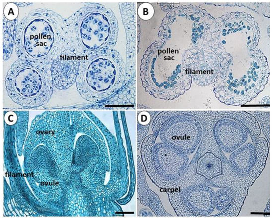 Structure of the garlic male and female organs. Scale = 100 μm. (A) Cross-section of anther during pollen meiosis. (B) Cross-section of anther after pollen maturation. (C) Longitudinal section of gynoecium during ovule development. Stamen filament is attached to the ovary basis. (D) Cross-section of the developing ovary.