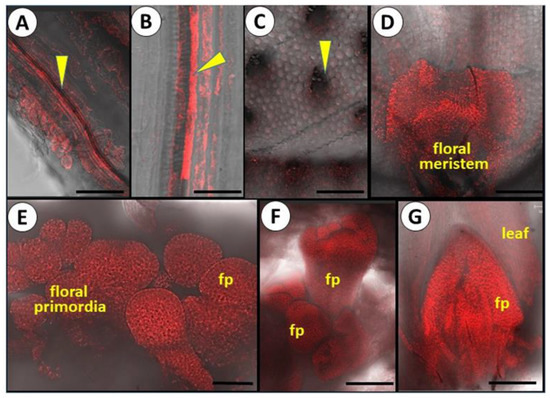 Microphotographs of FISH analysis of potyviruses spatial distribution in vegetative and reproductive tissues of fertile garlic accession. February/March 2022. Scale: A, B = 35 µm; C, F, G = 200 µm; D = 250 µm; E = 150 µm. (A) First seedling true leaf. Both phloem (arrow) and parenchyma are infected. (B) Young foliage leaf originated from the bulb clove. The phloem vascular tissue (arrow) is infected by potyviruses. (C) Cross-section of floral scape. The phloem vascular bundles (arrow) are infected. (D) Floral meristem, initiation stage, infected by potyviruses. (E) Differentiation of floral primordia (fp) infected by potyviruses. (F) Infected differentiating flower primordia; (G) Infected differentiated young flower.