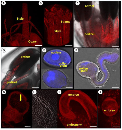 Representative confocal microscopy images of FISH tracing potyviruses’ spatial distribution in reproductive tissues and seeds of fertile garlic. Virus RNA was labeled by Cy-3. Pollen in E and F are stained with DAPI in addition to Cy-3. Scale: A, C, D, G, H, I = 250 µm; B = 50 µm; E, F = 10 µm; J = 150 µm. (A) Female flower organs, ovaries, style, and stigma. (B) Close-up of style, stigma, and papilla. A strong signal was recorded. (C) Male organs of garlic flower. The filaments are infected, while no signal is visible in the anthers. (D) Close-up shot of the anther. (E) Pollen grains before and after germination; vegetative and generative nucleus cells are colored by DAPI, and no signal from potyviruses is recorded. (F) Pollen tubes. Vegetative and generative nuclei cells are colored by DAPI. No signal from potyviruses is recorded. (G) Seed developing inside an ovary. (H) Seed coat, no visible signal. (I) Longitudinal section of viable seed before germination. Both embryo and endosperm are infected with potyviruses. (J) Cross-section of seed.