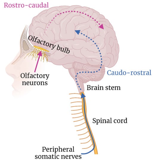 Infiltration of the CNS along transneural pathways is known for a number of viruses, including rabies virus, poliovirus and herpes simplex virus (HSV). However, research into arboviral infiltration of the CNS via transneural routes is comparatively limited. Two neuroanatomical areas have been postulated to be involved in CNS invasion, namely: peripheral nerves and olfactory nerves (Figure 2).
