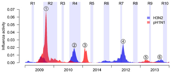 Timelines of our study. In our study, there were 10 rounds of sera collections (R1 to 10), which were represented by shaded regions. Local influenza activity in our study period, including pandemic A(H1N1) influenza virus (red), and seasonal A(H3N2) virus (blue). Circle with numbers indicate the epidemics analyzed in our study.