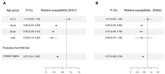 Estimates of relative susceptibility to infection for age groups and HAI titer. For age group relative susceptibility, the reference group of age is children less than or equal to 11 years of age. Panel (A): Estimates for pH1N1. Panel (B): Estimates for H3N2. Point and line indicate the point estimate and their 95% credible interval, which are constructed by using MCMC to fit the data with digraph model.